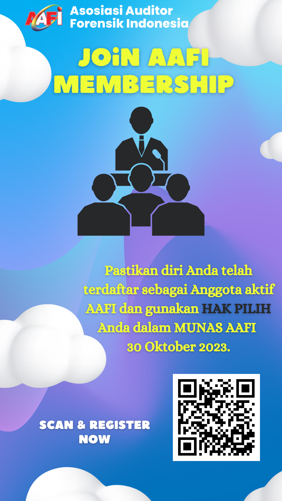 Asosiasi Forensik Auditor Indonesia (AAFI NIAS) mengundang Bapak/Ibu Anggota Aktif AAFI NIAS untuk melakukan pendaftaran Musyawarah Nasional (MUNAS) AAFI NIAS yang direncanakan akan dilaksanakan pada 30 Oktober 2023. Silakan melakukan pendaftaran di website AAFI NIAS dengan alamat www.aafinias.org/2023. Jangan lupa siapkan Sertifikat Certified Forensic Auditor (CFrA) dan Bukti Iuran Tahunan AAFI NIAS saat pendaftaran.